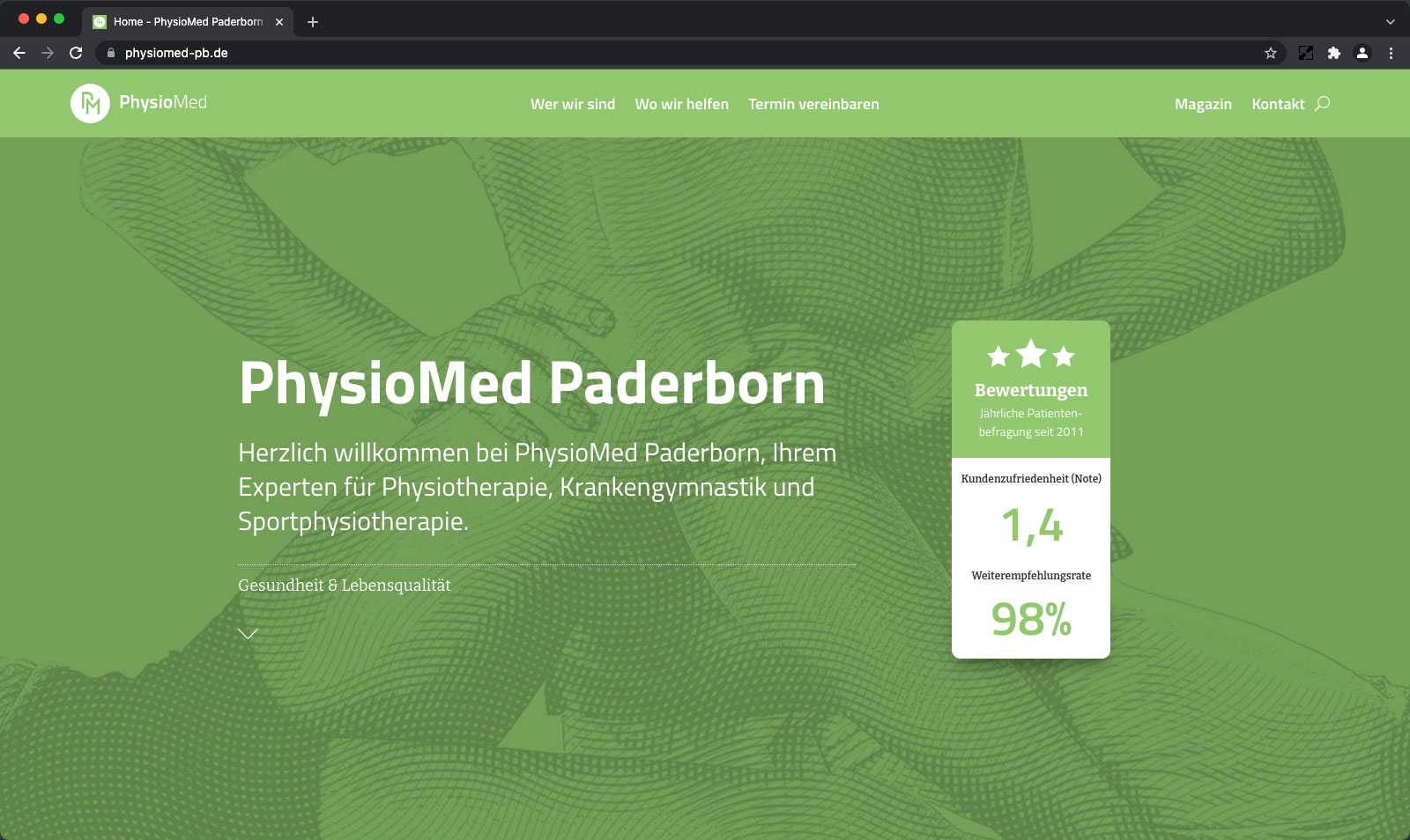 Mit einer Weiterempfehlungsrate von 98% und einer Benotung von 1,4 in der Kundenzufriedenheit, zeigt sich eindrucksvoll die Qualität der bisherigen Therapie-Leistungen. Doch was macht eine gute lokale Marke im Gesundheitsbereich langfristig aus? Wie erhält man die positiven Beziehung zu seinen Patienten? Und wie muss eine Website konzipiert sein, um die Kommunikation optimal zu unterstützen?