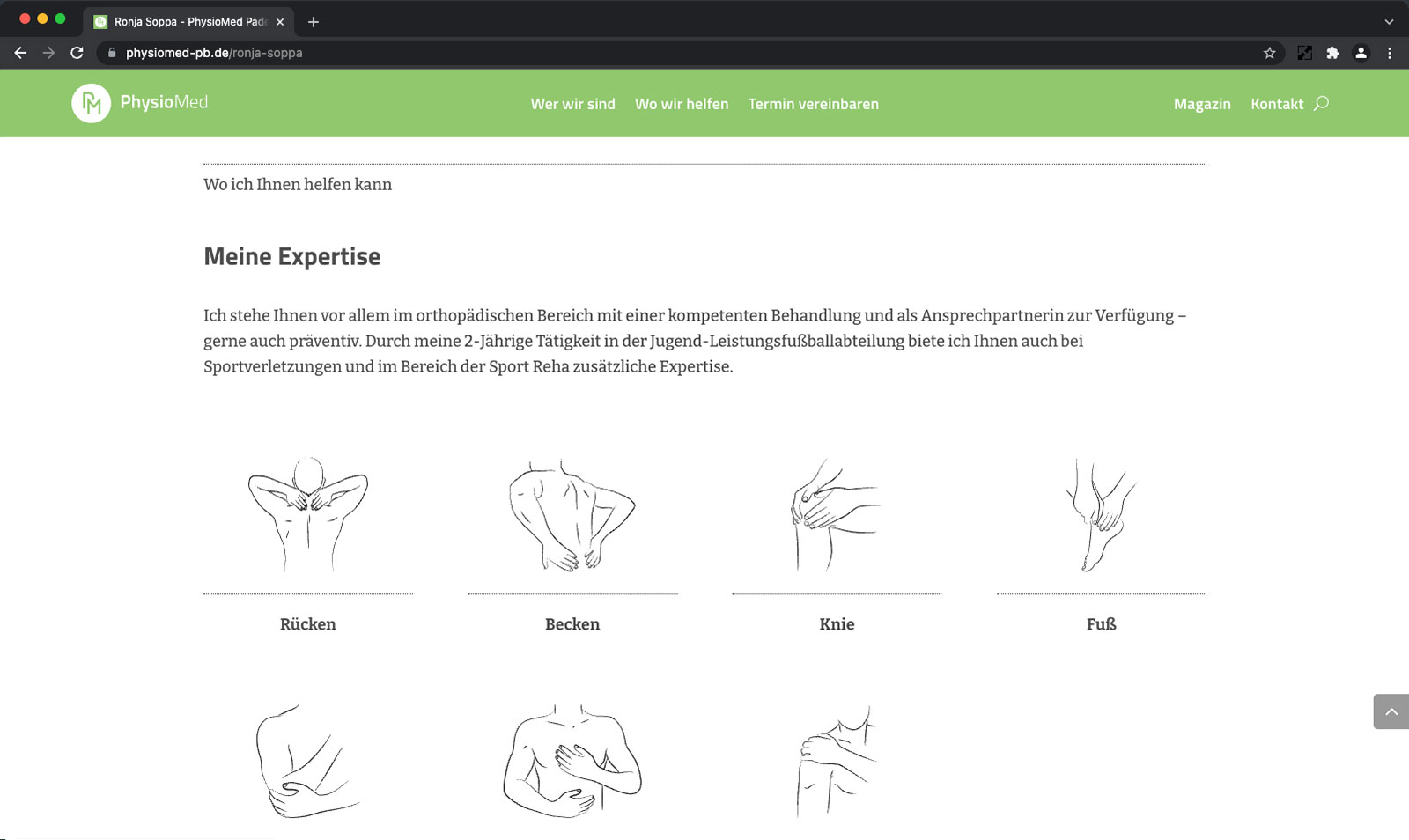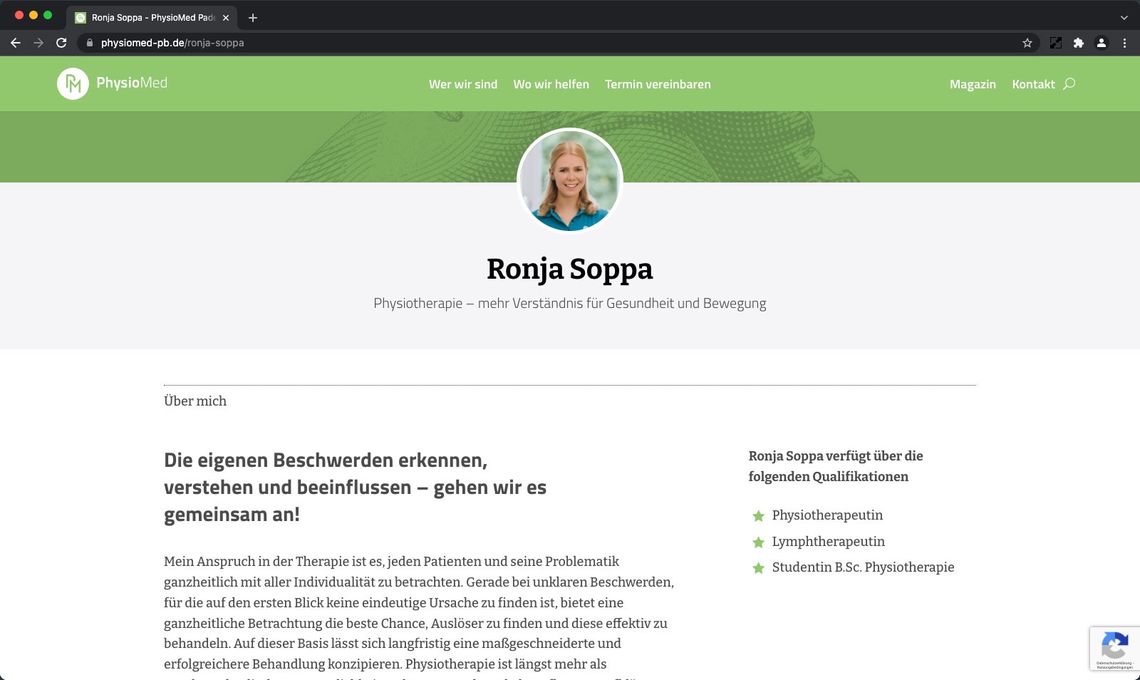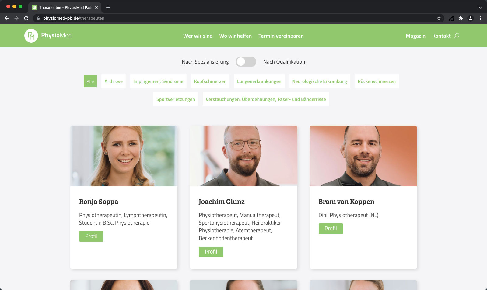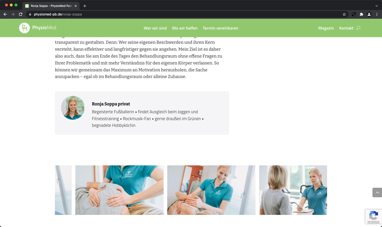 Eine körpernahe Behandlung erfordert Vertrauen und Nähe. Mit durchdachten Profilen präsentieren wir die Mitarbeiter von PhysioMed und geben erste Einblicke in deren berufliche Qualifikation und private Interessen. Das reduziert die Distanz und unterstützt den Wohlfühlfaktor beim ersten persönlichen Kennenlernen.